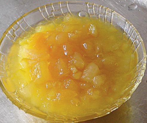 1. Pulpa de pepene se taie cuburi mici. Portocalele curăţate de coajă se taie felii subţiri, iar coaja se taie cubuleţe mici şi se lasă să stea cu zahăr. Se curăţă perele de coajă şi seminţe şi se taie cuburi mici.