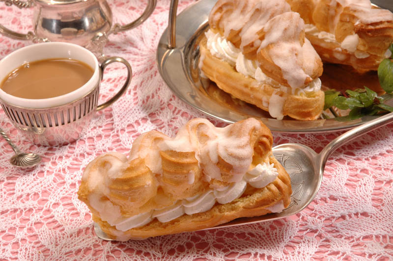 4. Cojile se umplu cu crema călduţă şi cu frişcă şi se stropesc cu glazura de ciocolată albă topită la baie de aburi. Puteţi să puneţi şi glazură de fistic sau de ciocolată neagră.