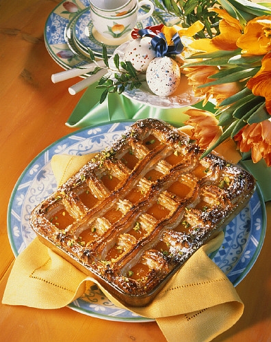 “îmbrăcate”. Se presară deasupra biscuiţii rămaşi, apoi se pune umplutura. Se toarnă jeleul şi deasupra se face un grilaj din aluatul rămas.