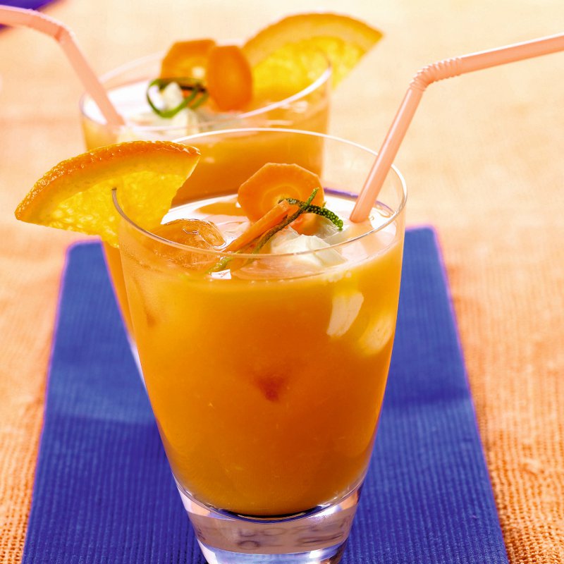 1. Se spală morcovii şi se pun la stors în strocătorul de fructe. Portocalele se curăţă de coajă şi se pun şi ele la stors, împreună cu jumătatea de lămâie verde. Coaja se păstrează pentru decor. Se amestecă sucul de morcovi cu cel de portocale şi se serveşte cu cuburi de gheaţă. Paharul cu suc se decorează cu feliuţe de portocală şi coajă de lămâie verde.