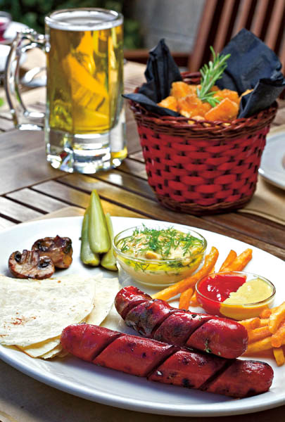 4. Separat, se taie cârnaţii, se condimentează cu boia şi rozmarin şi se pun pe grătar. Se curăţă ciupercuţele, se condimentează cu sare şi piper şi se pun pe grătar. Cârnaţii fripţi se servesc cu fasole bătută, ciuperci, cartofi prăjiţi și alte garnituri.
