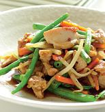 4. Fasolea verde fiartă se toarnă peste carne şi sosul de roşii, se toarnă într-o formă şi se bagă în cuptorul încins. Se scoate de la cuptor şi se serveşte cu pătrunjel proaspăt tocat mărunt.