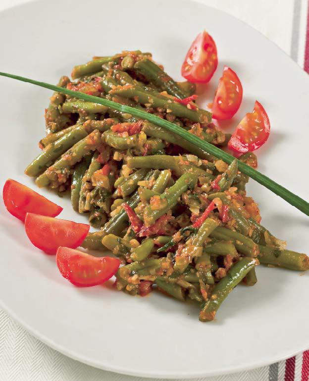 1. Fasolea verde se taie în bucăţi de 2-3 cm şi se opăreşte un pic în apă cu sare. Se dau sub un jet de apă rece şi se lasă la scurs.