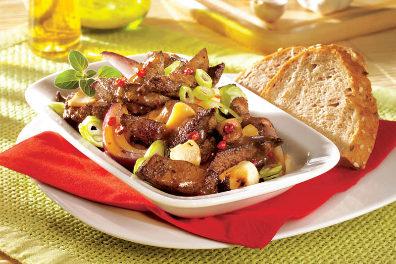 3. Se curăţă ceapa, ardeiul, se spală agrişele sau coacăzele şi se pun printre bucăţile de ficat. Se amestecă vinul cu 100 ml apă, cu untul topit şi se toarnă deasupra ficatului. Se condimentează cu piper, boia şi sare grunjoasă, se acoperă tava cu un capac şi se bagă în cuptorul încins.