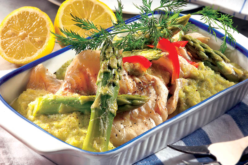 4. Se adaugă peştele, mugurii de sparanghel şi se ornează cu lămâie, ardei roşu şi mărar.