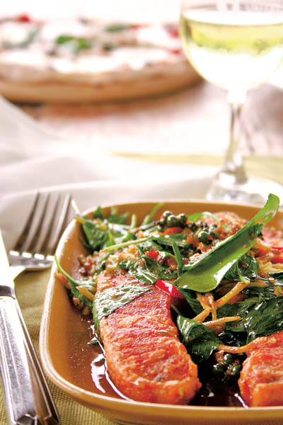 1. Se trec bucăţile de somon printr-un jet de apă, se ung cu ulei pe toată suprafaţa şi se condimentează cu sare şi piper. Se înfăşoară în folie de plastic şi se lasă câteva minute la frigider.