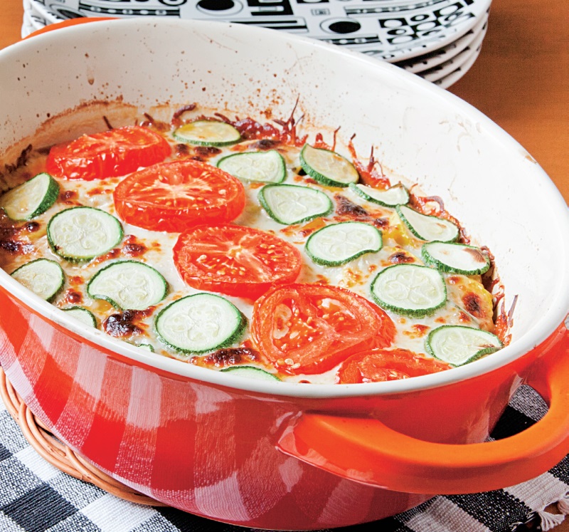 3. Se toarnă amestecul de ouă în vas, se pun felii de roşii şi dovlecei şi se lasă la cuptor pentru 25 de minute.