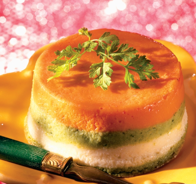 2. După ce s-au fiert, morcovii şi conopida se transformă în piureuri care se pun pe foc, separat cu 20 g de unt, inclusiv cu spanacul bine scurs. Se lasă apoi cele trei piureuri la răcit şi apoi se adaugă în fiecare câte un gălbenuş şi 20 g parmezan (sau caşcaval).
