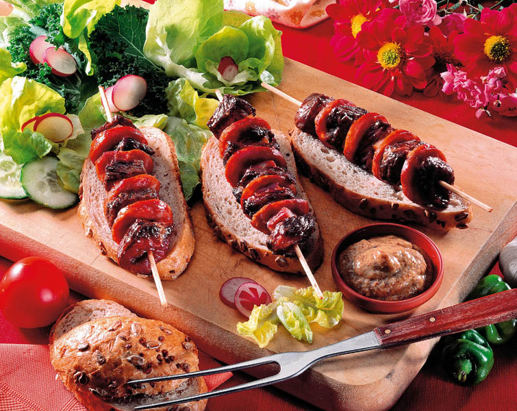 2. Se taie cârnaţii rondele destul de groase ca să nu se ardă prea tare cât stau pe grătar. Se pun pe băţul de frigăruie. Intercalaţi cu câte o feliuţă de şuncă.