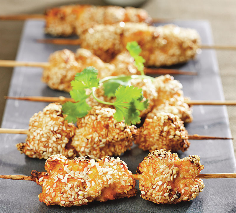 2. Peste carne se pune muştar şi se amestecă foarte bine, apoi bucăţile de carne se trec prin susan şi se înfig pe beţele umede.