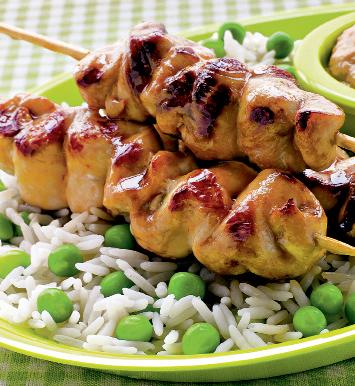 4. Frigăruile de pui se servesc cu untul de arahide şi cu garnitura de orez cu mazăre. Se ornează cu frunzuliţe de pătrunjel verde.