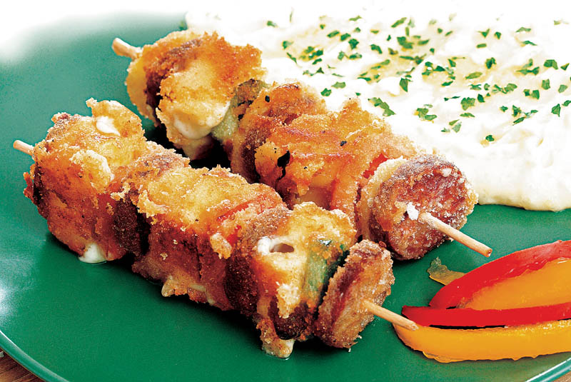 1. Cârnatul se taie rondele, caşcavalul se taie cubuleţe de 2-3 cm, ceapa se curăţă şi se taie în sferturi, iar ardeiul gras se sşpală, se curăţă şi se taie bucăţi de 3-3,5 cm. Toate ingredientele astfel pregătite se pun pe beţe de frigărui, puţin umezite, alternând rondelele de cârnat cu câte o foaie de ceapă, un cub de caşcaval şi câte o bucată de ardei gras.