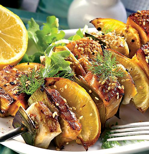 - Separat, se spală lămâile, se şterg şi se taie felii. După ce s-au pregătit toate ingredientele, se înfig în beţele de frigărui în următoarea ordine: 3-4 fâşii de praz, o bucată de file de fitofag, o felie de lămâie şi tot aşa, până se formează o frigăruie. După ce s-au pregătit toate frigăruile, se toarnă puţin ulei de măsline pe deasupra lor şi se presară susanul.