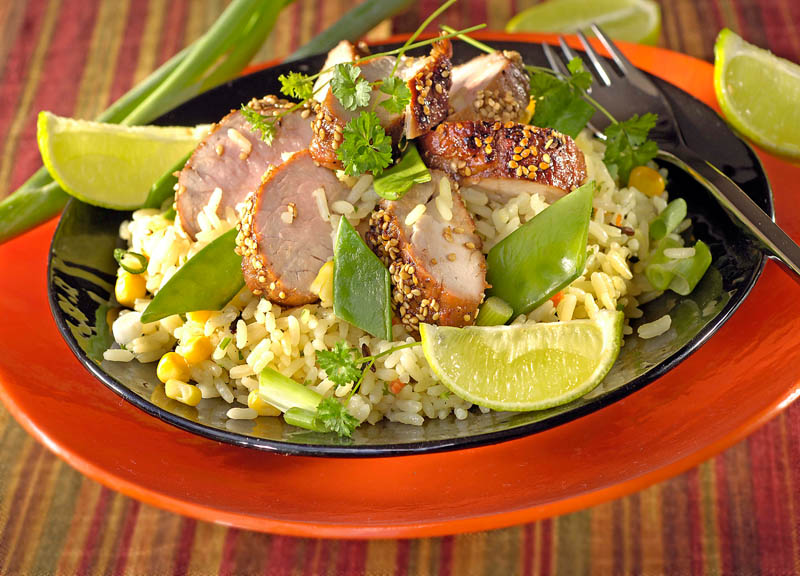 3. Se scoate friptura din cuptor şi după ce se răceşte puţin, se rupe folia şi friptura se unge cu miere diluată în vin. Se presară apoi cu susan şi se mai coace la foc potrivit 15-20 de minute. Se taie felii şi se serveşte cu garnitură de orez şi lămâie.