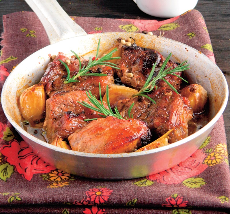 2. În tigaie se pun si caţeii de usturoi în camasa si se întoarce carnea periodic, pentru a se rumeni frumos pe toate parţile.