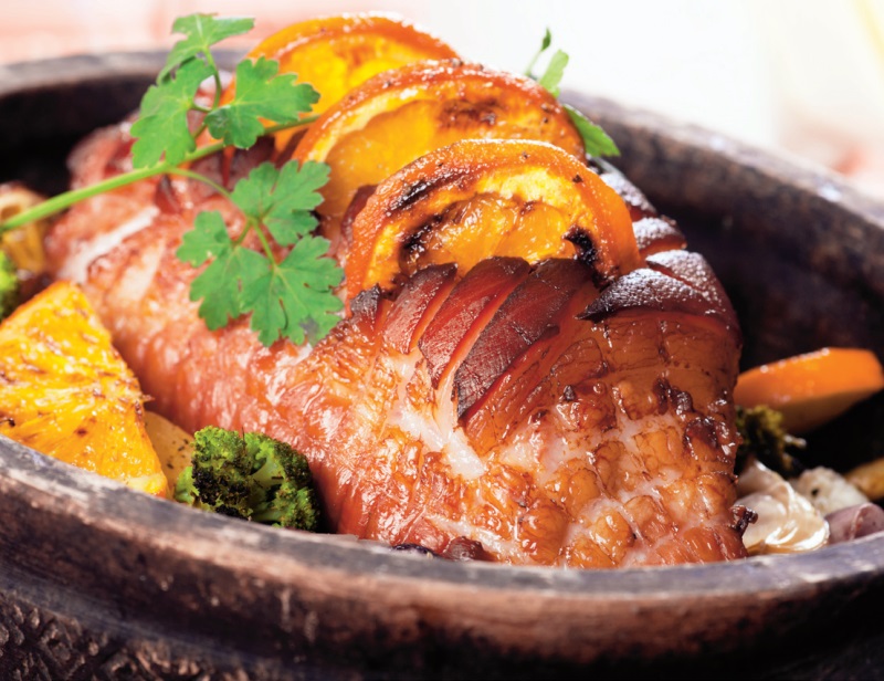 3.    Se unge carnea cu mustar, se înfig din loc în loc cuisoarele si în pliurile facute în sorici se asaza feliile unei portocale.