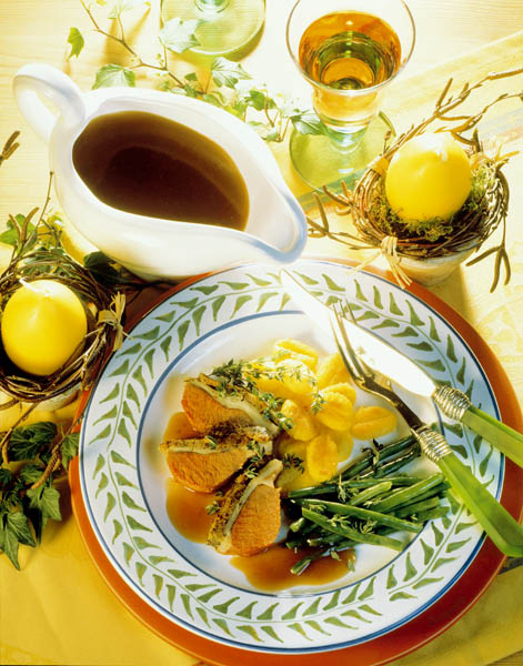 4. Cotletul se taie felii şi se serveşte cu sos, garnituri şi salate de sezon. Pentru sos, se trece tot ce-a rămas în tavă printr-o sită, se subţiază cu puţin vin, se condimentează şi se fierbe la foc mic, 5 minute.