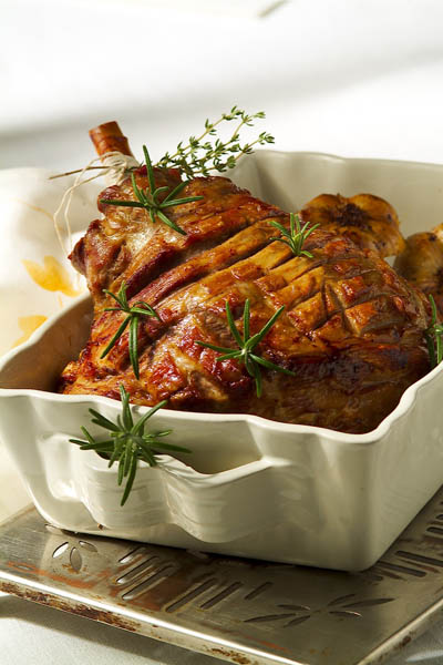 2. Între timp, de încinge cuptorul, iar usturoiul se curăţă şi se toacă mărunt. Se alege o tavă potrivit de mare pentru bucata de carne şi se unge cu puţin ulei. Se presară apoi usturoiul trecut printr-un jet de apă fierbinte. Se aşază carnea şi se adaugă vinul îndoit cu apă. Se pune în cuptorul încins şi se coace, la foc iute, 55-65 minute. Se întoarce friptura şi se stropeşte din când în când cu sosul din tavă, iar în ultimele 15 minute se reduce focul la potrivit.