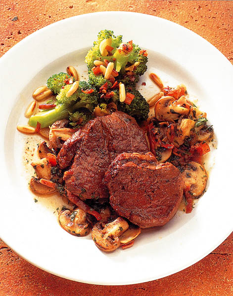1. Carnea se spală şi se taie felii de 1-2 cm grosime. Se condimentează cu sare şi piper, apoi se stropeşte cu puţin oţet şi se lasă la marinat o oră. Între timp, se pregătesc ciupercile, ceapa şi usturoiul.