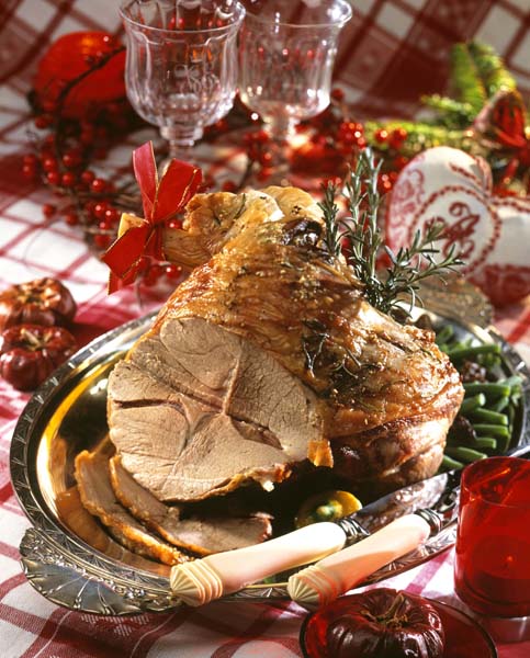 3. Se scoate tava din cuptor, se unge carnea cu sosul din tavă şi se stropeşte cu rom. Se acoperă friptura cu un capac sau cu un castron pentru a-şi păstra suculenţa, dar şi să se rumenească frumos, fără să se ardă. Se mai unge din când în când cu sosul din tavă şi unt, până când friptura este gata şi se pătrunde uşor cu furculiţa. Se coace în total aproximativ două ore.
