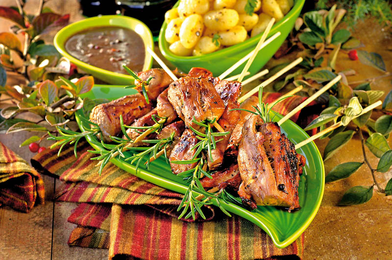 4. După ce s-au făcut, se presară crenguţe de rozmarin pe deasupra şi se acoperă cu o folie câteva minute până se servesc. Separat se pregătesc cartofii pentru garnitură, fie fierţi şi gratinaţi, fie copţi pe grătar.