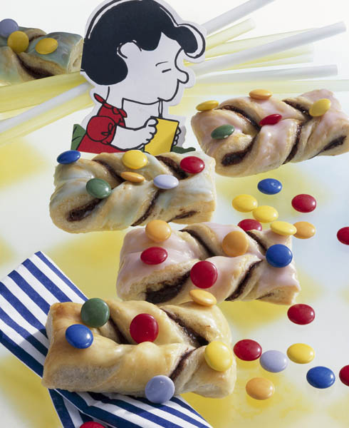 2. Se unge jumătate din foaie cu crema de ciocolată şi se acoperă apoi cu cealată parte de aluat, neunsă. Se obţine o foaie de aluat lată de 7-8 cm, care se taie în fâşii late de 3-4 cm. Se face la fiecare bucată de aluat câte o crestătură în lung, pe mijloc, prin care se trece unul din capete, ca o fundiţă.