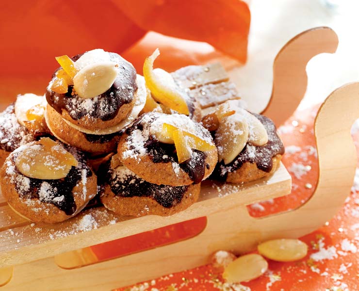3. Se acoperă cu glazură de ciocolată, zahăr şi fructe confiate şi se ornează cu migdale. Pentru glazura de ciocolată se topeşte la cald ciocolata rasă cu untul.