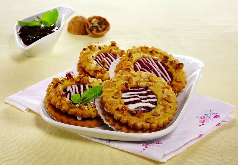 2.Se întinde o foaie potrivit de groasă, care se taie cu forme de fursecuri. Se aşază biscuiţii în tava de copt tapetată cu hârtie şi se dau la cuptor pentru aproximativ 20 de minute. După ce sunt gata, se scot, se lasă să se răcească şi se lipesc cu gem, apoi se ornează cu fulgi de migdale, nucă măcinată sau cocos, după preferinţă.