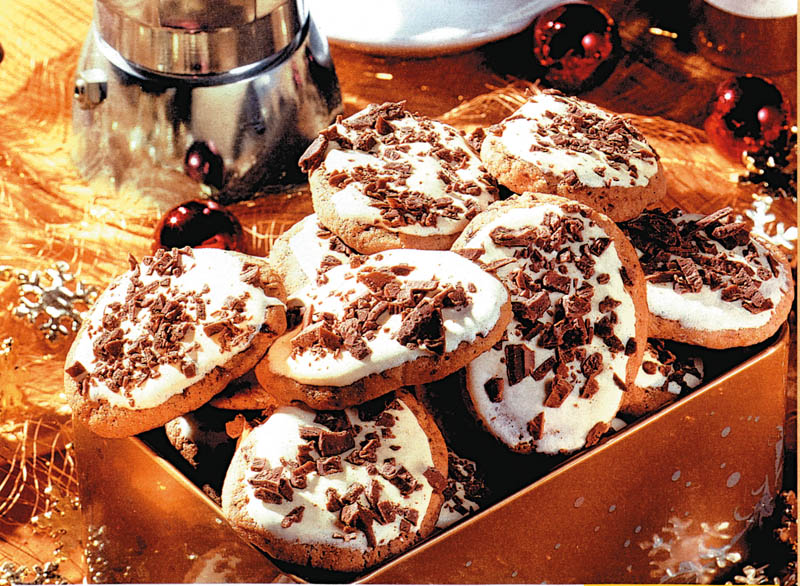 3. Pentru glazură, se bate albuşul spumă, apoi se adaugă 200 g zahăr şi zeama de portocală. Se freacă până se topeşte zahărul şi devine ca o smântână. Se pune pe fiecare fursec, se presară ciocolata rasă şi se lasă să se usuce.