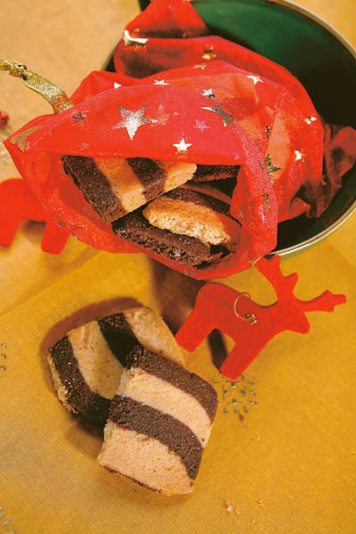 1. Ouăle se bat cu zahărul tos, zahărul vanilat şi 2 linguri de apă, până se topeşte tot zahărul. Se adaugă untul şi se împarte în două. Jumătate din compoziţie se amestecă cu 200 g făină cernută cu un praf de copt şi cacaua, iar cealaltă jumătate se amestecă cu 300 g făină cernută cu un praf de copt. Se frământă rapid fiecare din cele două compoziţii, se acoperă cu folie transparentă şi se ţine la rece 30 minute.