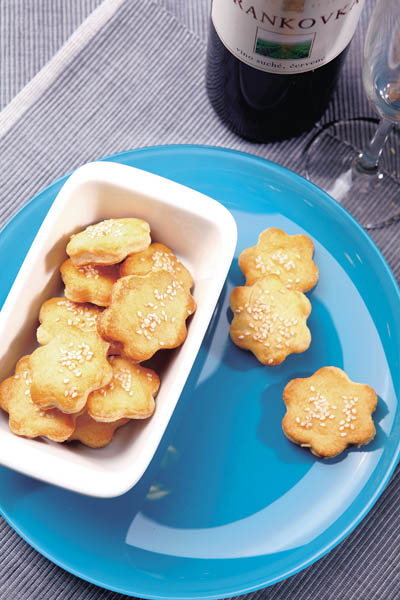 2. Se întinde aluatul într-o foaie groasă de 3-4 mm, din care se taie fursecuri. Se aşază într-o tavă unsă cu grăsime şi tapetată cu făină, apoi se ung cu gălbenuş şi se presară cu seminţe de susan.