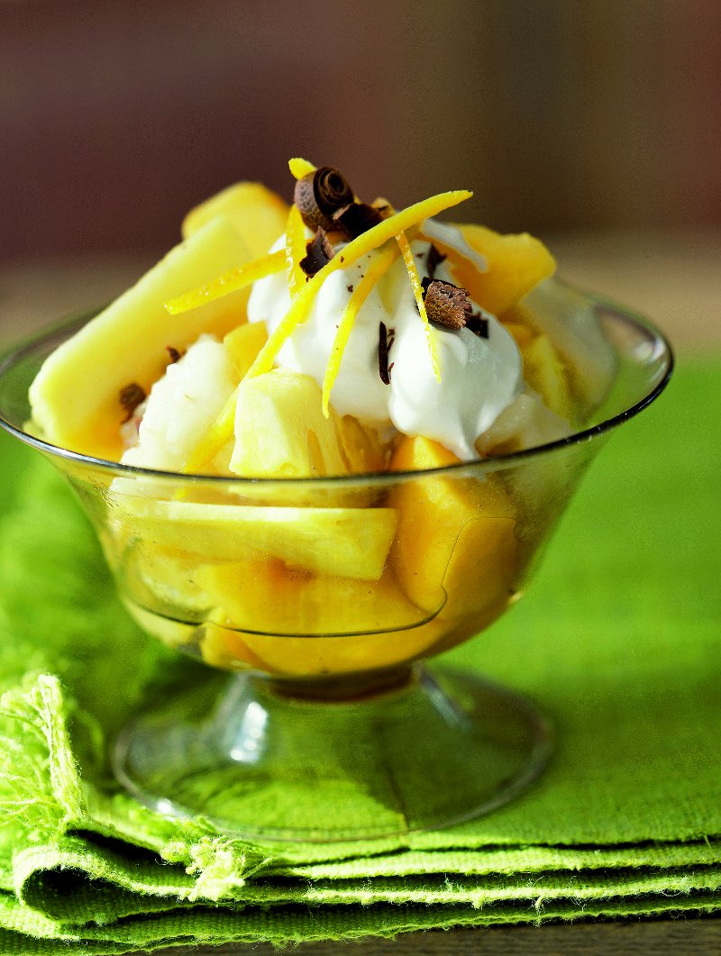 1. Perele, mango şi bananele se curăţă de coajă şi se taie felii. Se pun într-un castron mare, se adugă feliile de ananas tăiate şi puţin suc din compot. Se amestecă uşor bucăţile de fructe, se adaugă coniacul şi se ţine două ore la frigider.