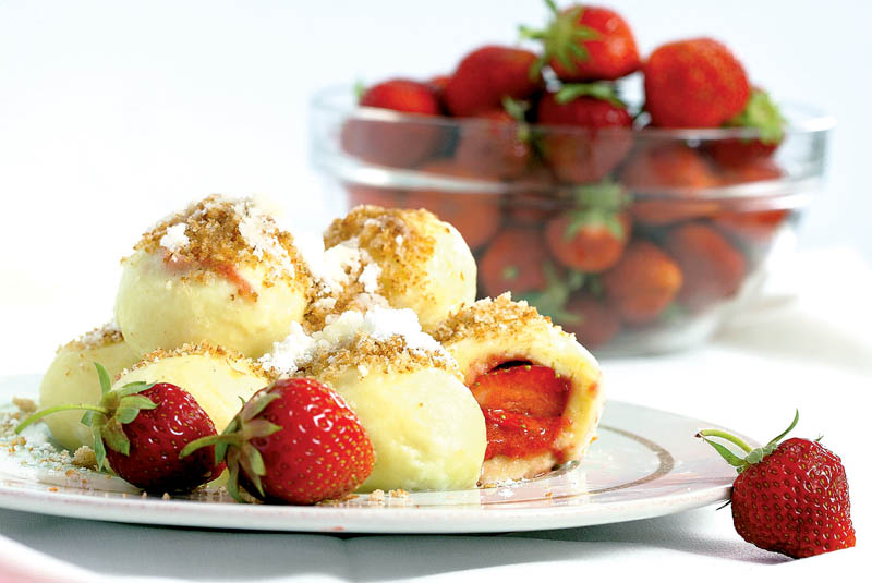 4. Se taie aluatul în 12 felii, care se pun pe o planşetă presărată cu făină. Pe fiecare felie de aluat se pune câte o căpşună şi se strânge aluatul în jurul ei, până se obţine o găluşcă sferică, ce se trece apoi prin făină şi se lasă deoparte.