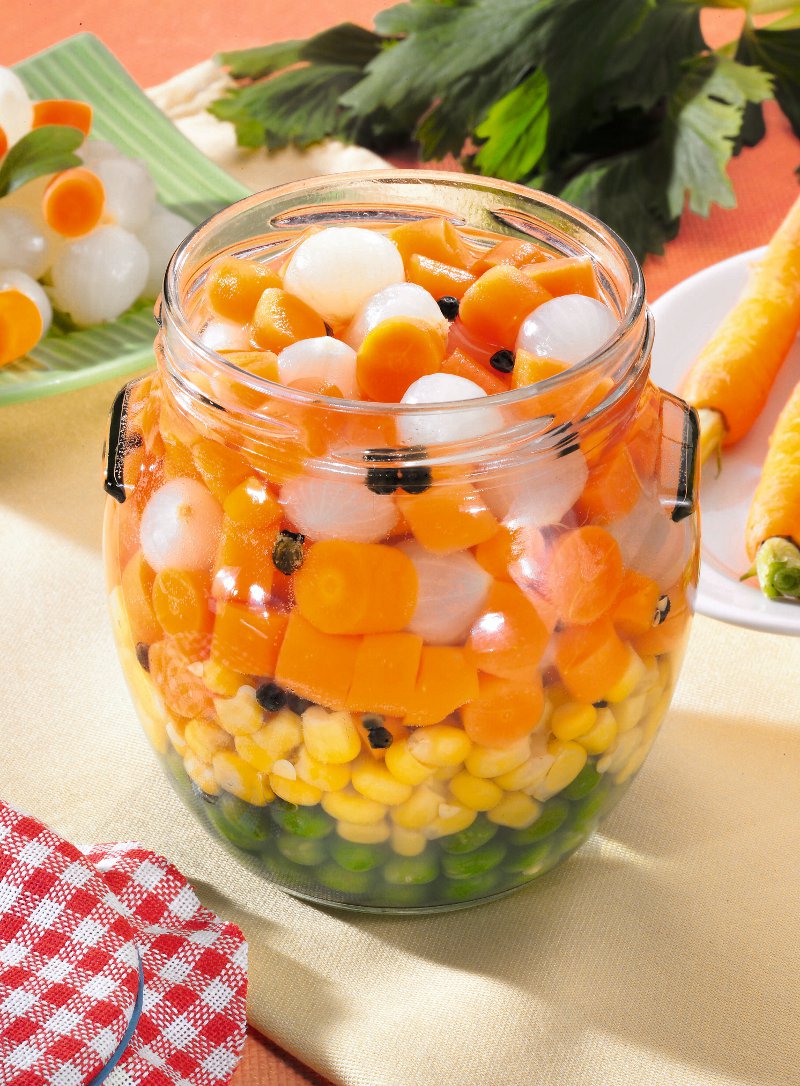 4. Separat se pregăteşte compoziţia din cantităţile de apă, oţet, piper, muştar, frunze de ţelină şi foi de dafin. Se fierbe în câteva clocote şi se lasă la rece. Se aranjează legumele în borcane şi se umplu cu zeamă. Se acoperă cu capacul şi se pun la păstrare.