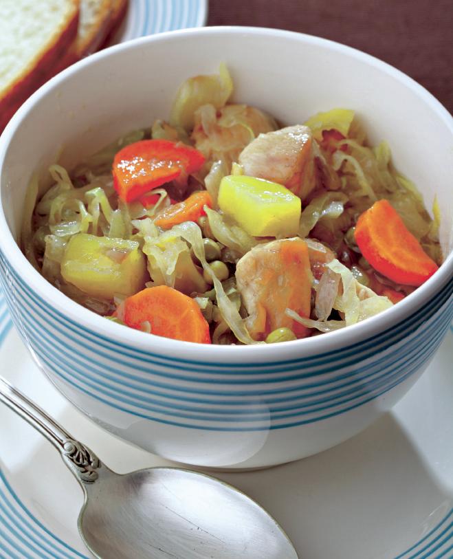 2. Între timp, se curăţă legumele şi se spală bine. Cartofii se taie cubuleţe, morcovii se taie rondele, ceapa, solzişori, ardeii, fâşii, varza se toacă mărunt iar mazărea se fierbe în prealabil.