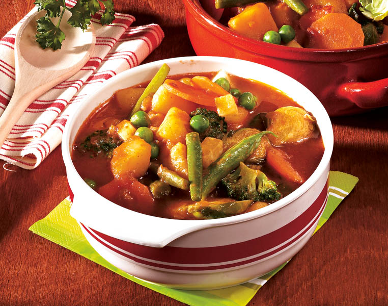 2. Se curăţă legumele, se spală şi se taie fiecare după preferinţă: morcovii se taie rondele, cartofii cubuleţe, ceapa şi ardeii fâşii subţiri, fasolea se fierbe separat ca să fie moale şi mazărea la fel. Apoi se adaugă, pe rând, în cratiţă. Se lasă la foc potrivit, se adaugă piureul de roşii şi se condimentează cu sare, piper, boia, cimbru şi busuioc.