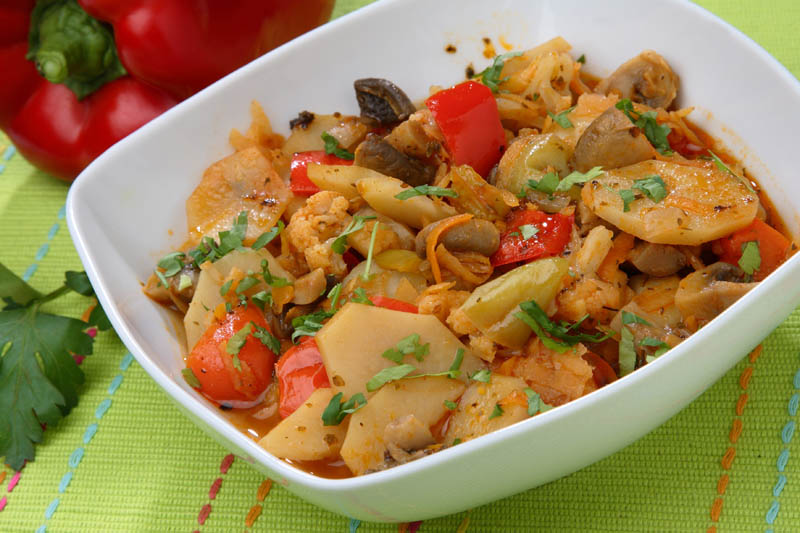 1. Toate legumele se curăţă şi se spală. Usturoiul fin tocat se căleşte foarte puţin în uleiul încins, la care se adaugă imediat ciupercile tăiate felii. Se înăbuşă puţin, amestecând continuu.