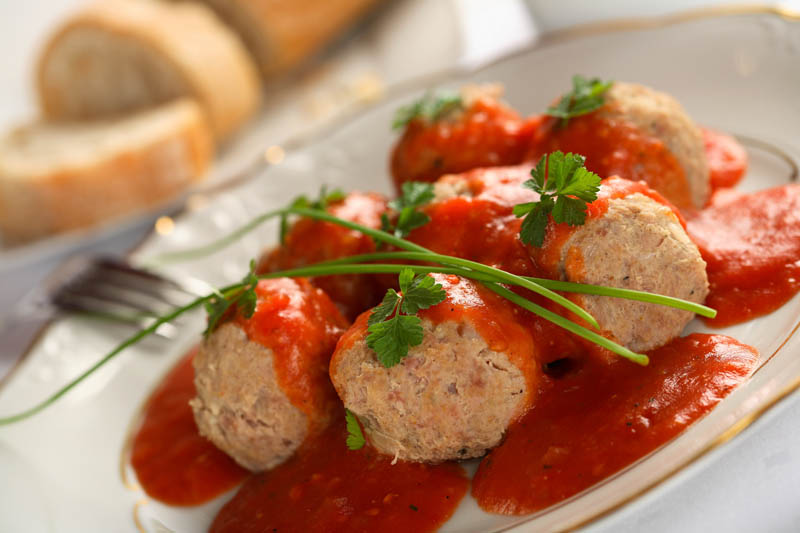 4. Biluţele de carne se pun în sos şi se bagă la cuptor câteva minute să scadă şi să se rumenească. Se servesc cu garnitură de salată verde sau de cartofi şi se ornează cu busuioc verde sau pătrunjel.