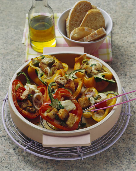 4. Se desfac ardeii cu grijă să nu se rupă şi se umplu cu compoziţia deja pregătită. Se pun într-o tavă cu uleiul de măsline, iar pe fiecare gogoşar se aşază bucăţele de mozzarella, apoi se bagă la cuptorul încins, aproximativ 20 de minute. După ce se scot din cuptor se lasă să se răcească şi se servesc reci, la aperitiv.