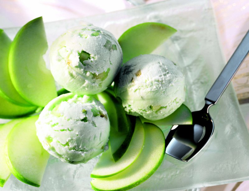 3. Restul de măr se taie feliuţe şi se stropesc cu zeama de lămâie pentru a nu se oxida. Îngheţata se serveşte cu feliuţe de măr în jurul ei.