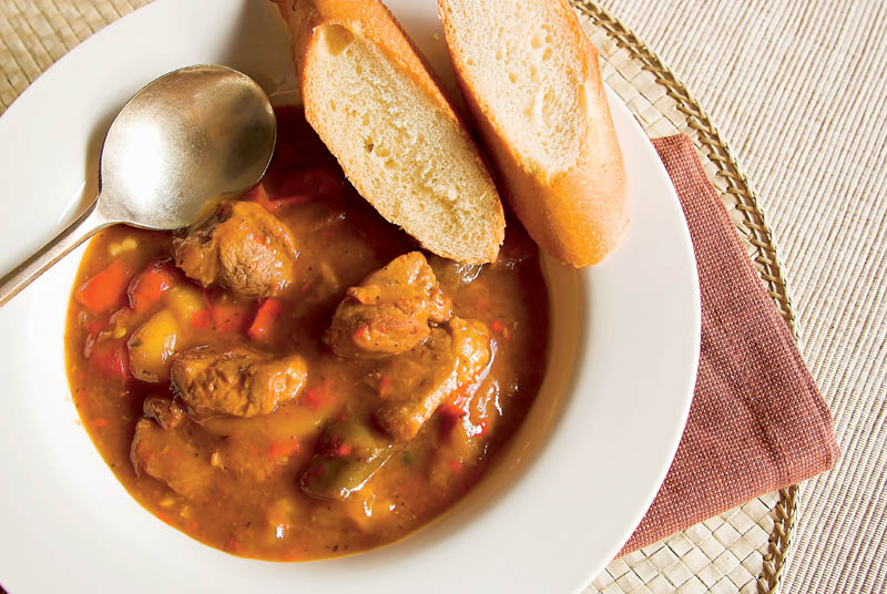3. Se curăţă şi se taie cartofii cubuleţe, ardeii se taie fâşii potrivite şi se pun în cratiţă împreună cu supa de carne rămasă şi se mai lasă la fiert câteva minute.