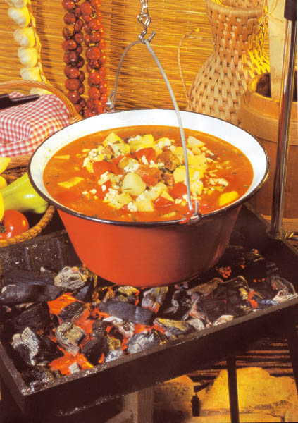 2. Când toate legumele şi carnea sunt bine fierte, se adaugă sucul de roşii, ardeiul gras şi roşiile tăiate cubuleţe. Se mai lasă pe foc 15-20 minute şi se potriveşte la gust cu sare, boia de ardei şi piper. Se aromează cu pătrunjel verde tocat mărunt.