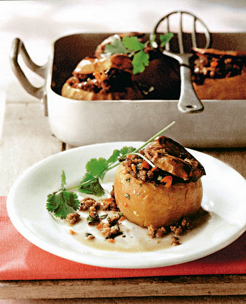 4. Se umplu guliile cu compoziţia de carne şi se pun într-o tavă unsă cu ulei. Se toarnă apă cât să acopere legumele pe jumătate şi se pun în cuptorul încins 35 – 40 minute.