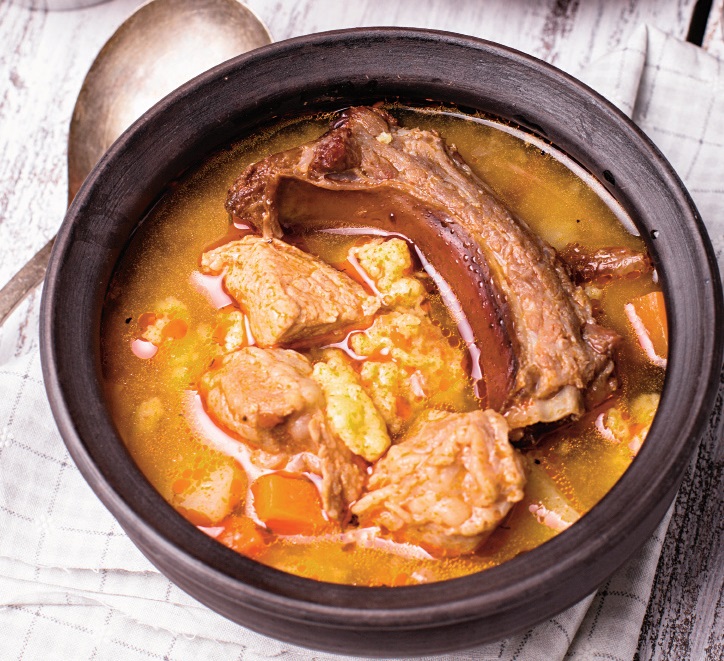 1. Într-un vas de fontă, de preferinţă, se încinge uleiul şi se căleşte ceapa tăiată mărunt. După ce a devenit aurie, se adaugă carnea tăiată cuburi şi coasta afumată.