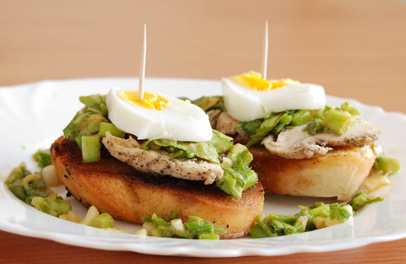 4. Firele de usturoi se toacă mărunt şi se amestecă cu uleiul de măsline şi puţină sare. Peste frunzele de salată se pun feliile de ouă, iar pe deasupra se presară usturoiul tocat. Se servesc imediat. Această gustare este uşor şi rapid de preparat.