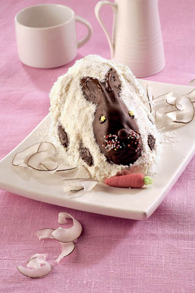 3. Cu ajutorul unei forme speciale de iepuraş, se pune compoziţia, se modelează după formă şi se pudrează cu nucă de cocos pe toată suprafaţa. Se lasă la rece câteva minute să se întărească.
