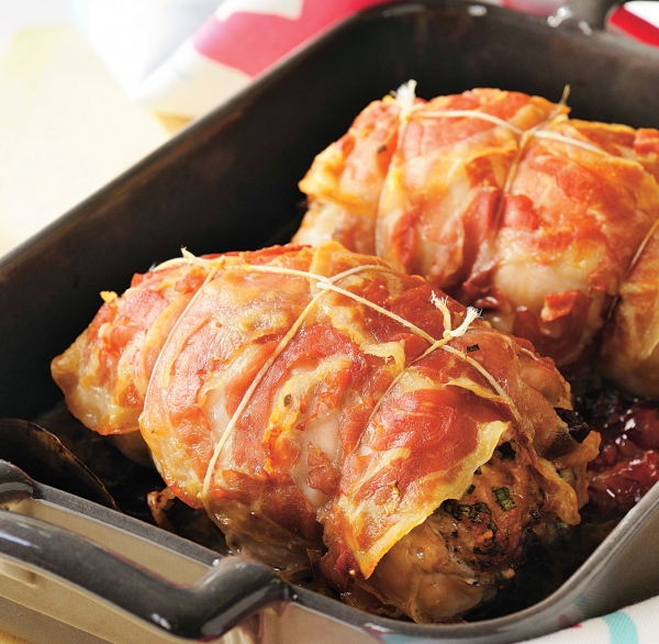 1. Carnea se porţionează şi se împănează cu usturoi feliat. Apoi fiecare bucată de carne se înveleşte în bacon şi se leagă cu sfoară de bucătărie.