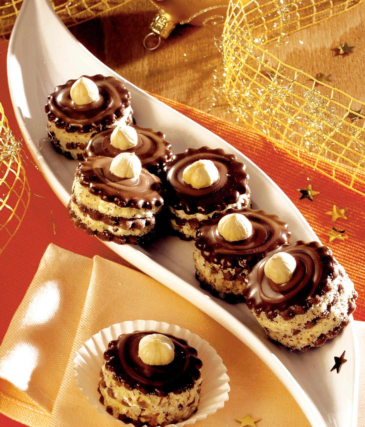 1. Se prepară un aluat din făină, zahăr, unt, gălbenuşul de ou şi cacao. Se pune într-o folie şi se lasă la frigi­der pentru cel puţin două ore. Se scoate aluatul şi se taie rondele de 3 milimetri grosime, cu diametrul de 2 cm. Se coc timp de 8 minute în cuptorul preîncălzit la foc tare. Se lasă să se răcească şi se pune crema.
