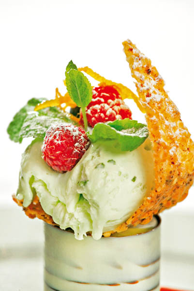 4. În crema obţinută, se pune esenţa de mentă. Amestecul se toarnă în cutii şi se bagă la congelator aproximativ 4 ore. Se serveşte ornată cu frunzuliţe de mentă, napolitană caramelizată şi zmeură.