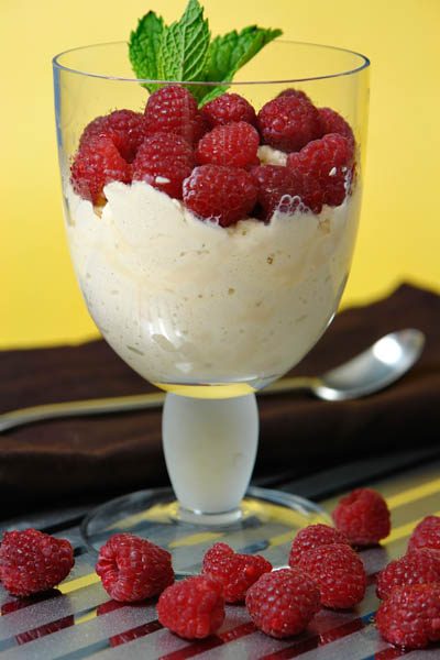 2. Se mixează din nou, până devine din nou cremoasă şi se congelează 1-1,5 ore, doar cât să se întărească puţin. Se serveşte cu zmeură sau alte fructe de sezon.